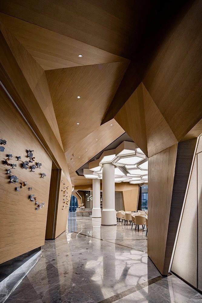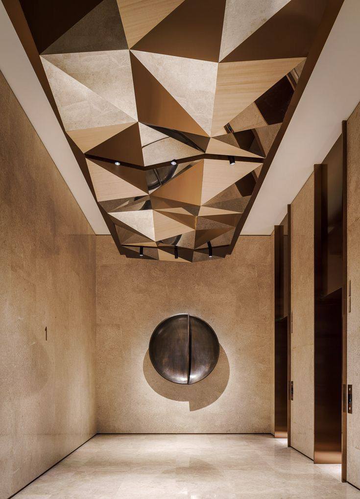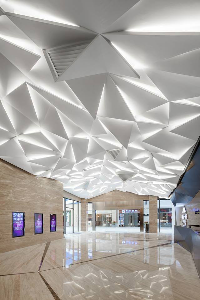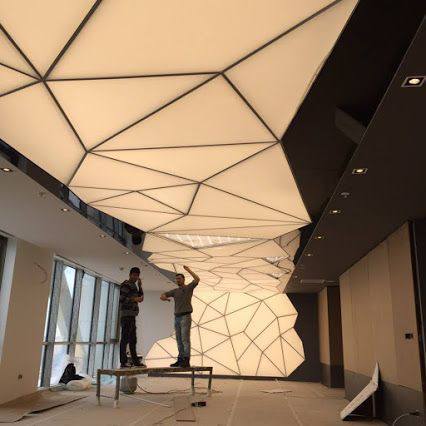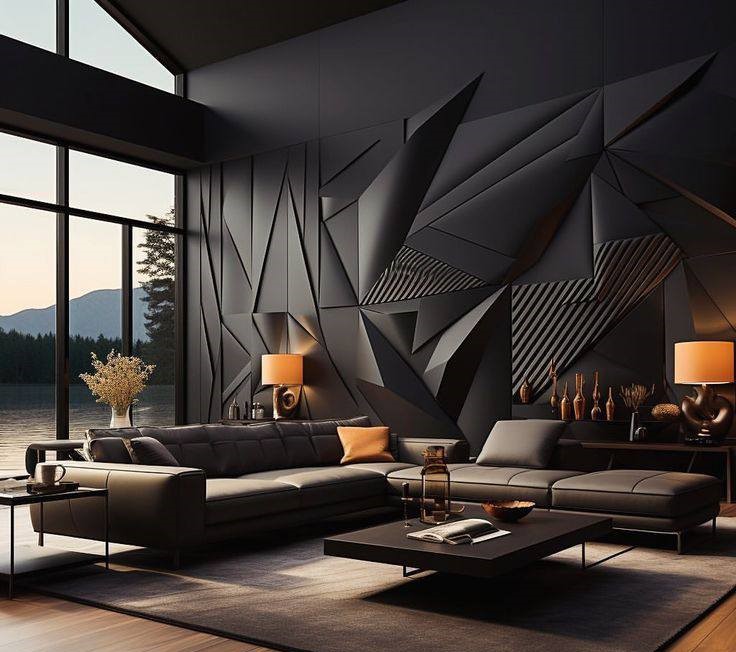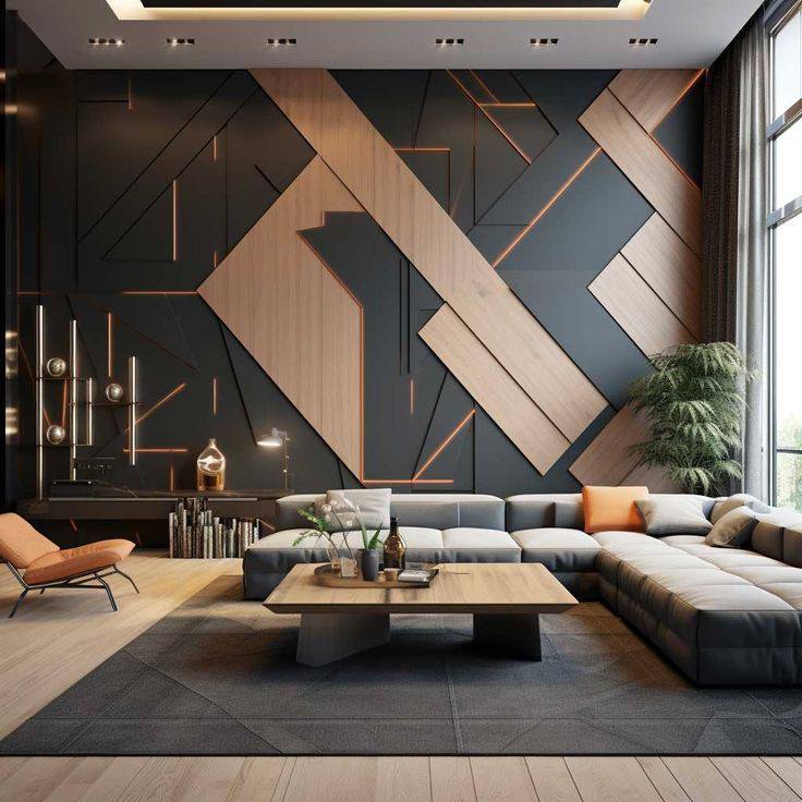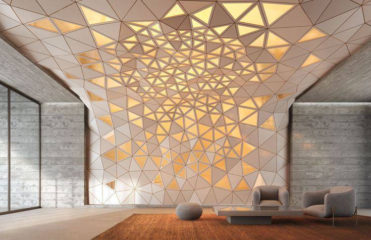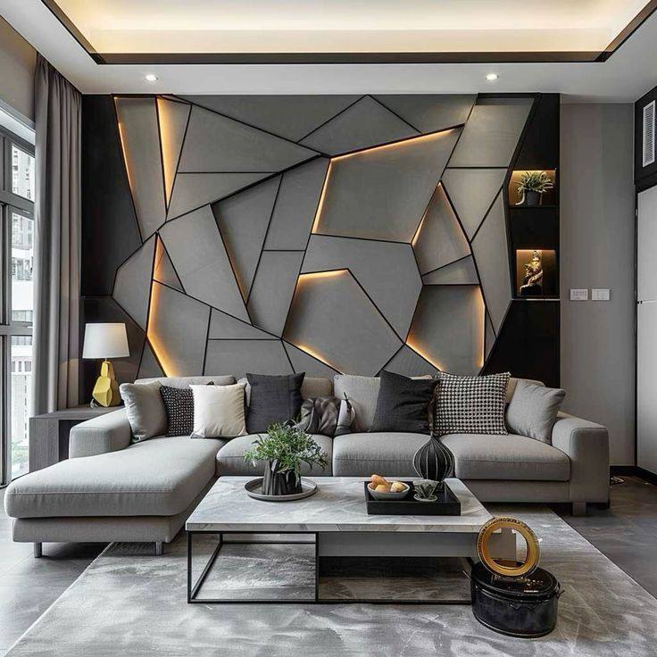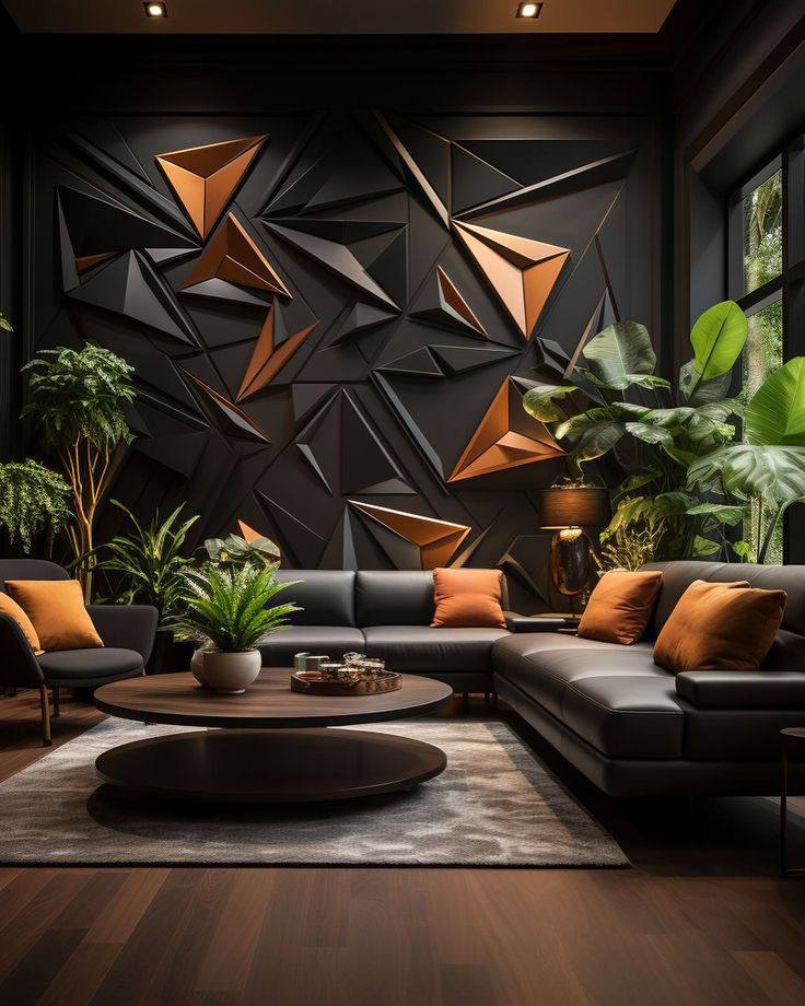 Primena na plafonu je posebno upečatljiva. Umesto ravne površine, plafon sa trokutastim ulegnućima ili naglaskima stvara dramatičnu igru svetlosti i senke. Ovi elementi mogu biti uklesani, postavljeni kao 3D obloge ili naglašeni LED trakama duž ivica. Ovakav pristup vizuelno podiže visinu prostorije i skreće pažnju na vertikalu, čineći sobu prostranijom.